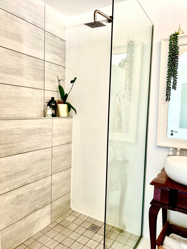 The unit opens onto a rose garden with never-ending sea views, including a braai area and nook under the old Frangipani tree. Secure parking is available on the premises
