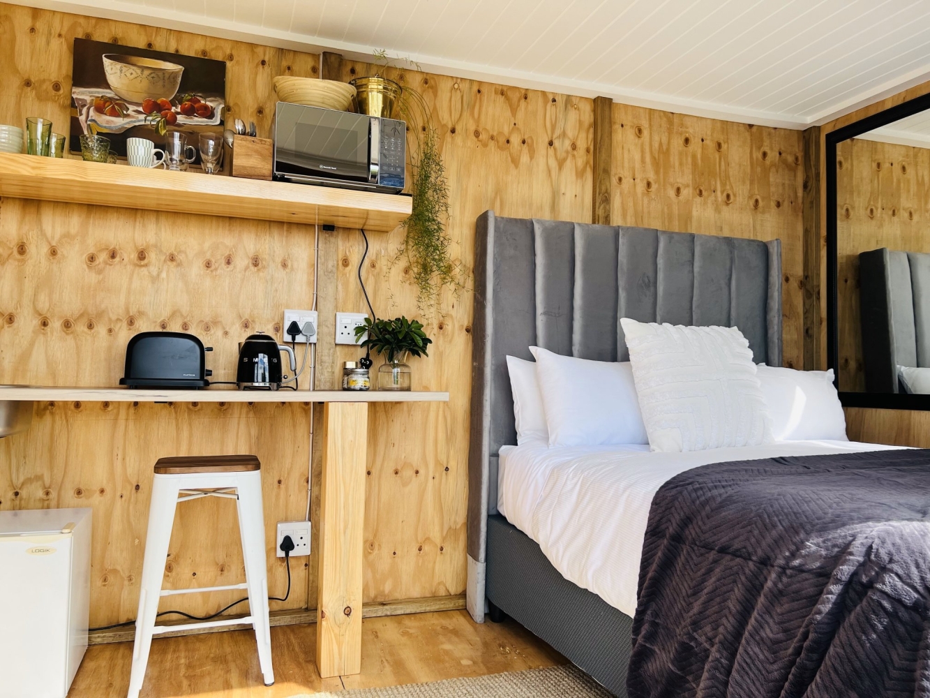 The living area features an open-plan design with a fully equipped kitchenette including a microwave, bar fridge, air-fryer, kettle, toaster, cutlery, and crockery.