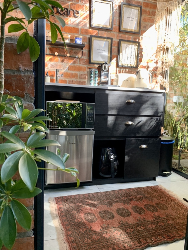The living area features an open-plan design with a fully equipped kitchenette including a microwave, bar fridge, air-fryer, kettle, toaster, Nespresso machine, cutlery, and crockery.