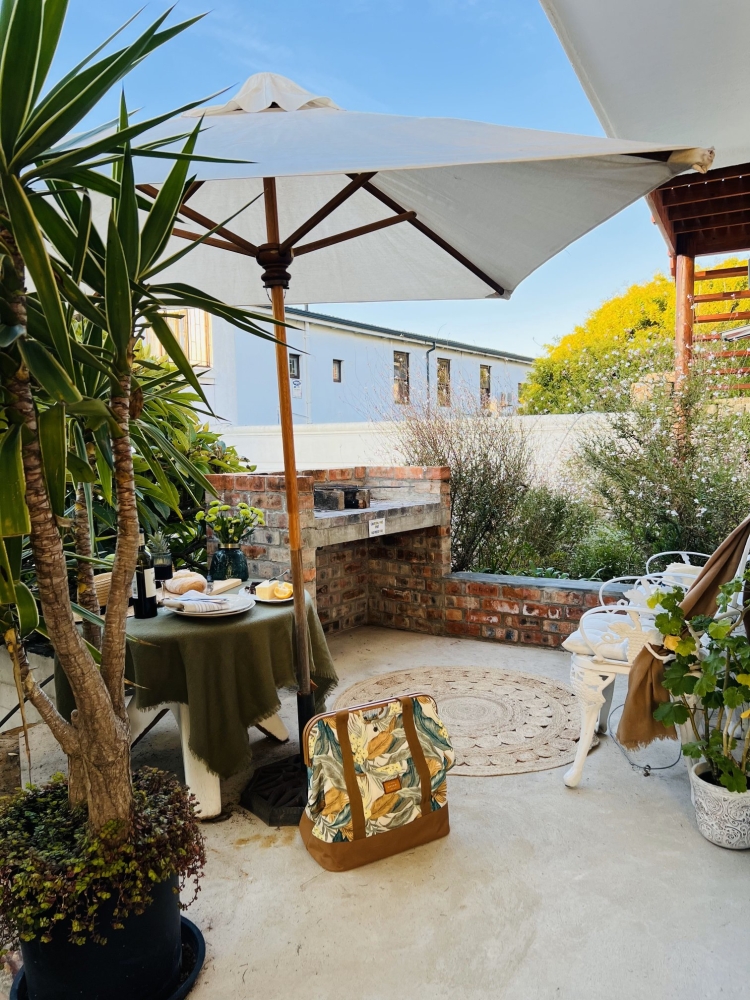 The unit opens onto a rose garden with never-ending sea views, including a braai area and nook under the old Frangipani tree. Secure parking is available on the premises
