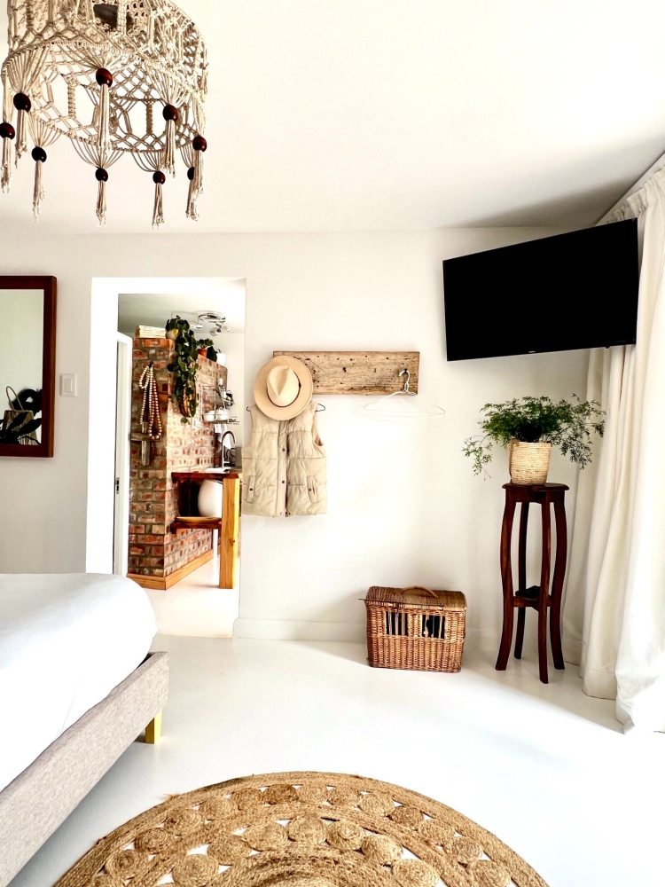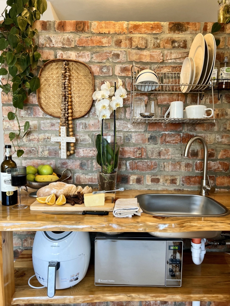 The living area features an open-plan design with a fully equipped kitchenette including a microwave, bar fridge, air-fryer, kettle, cutlery, and crockery. The lounge is furnished with comfortable seating.