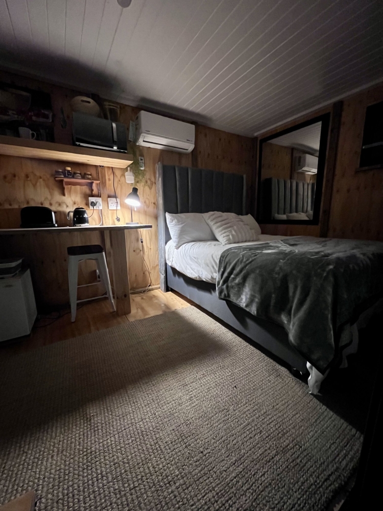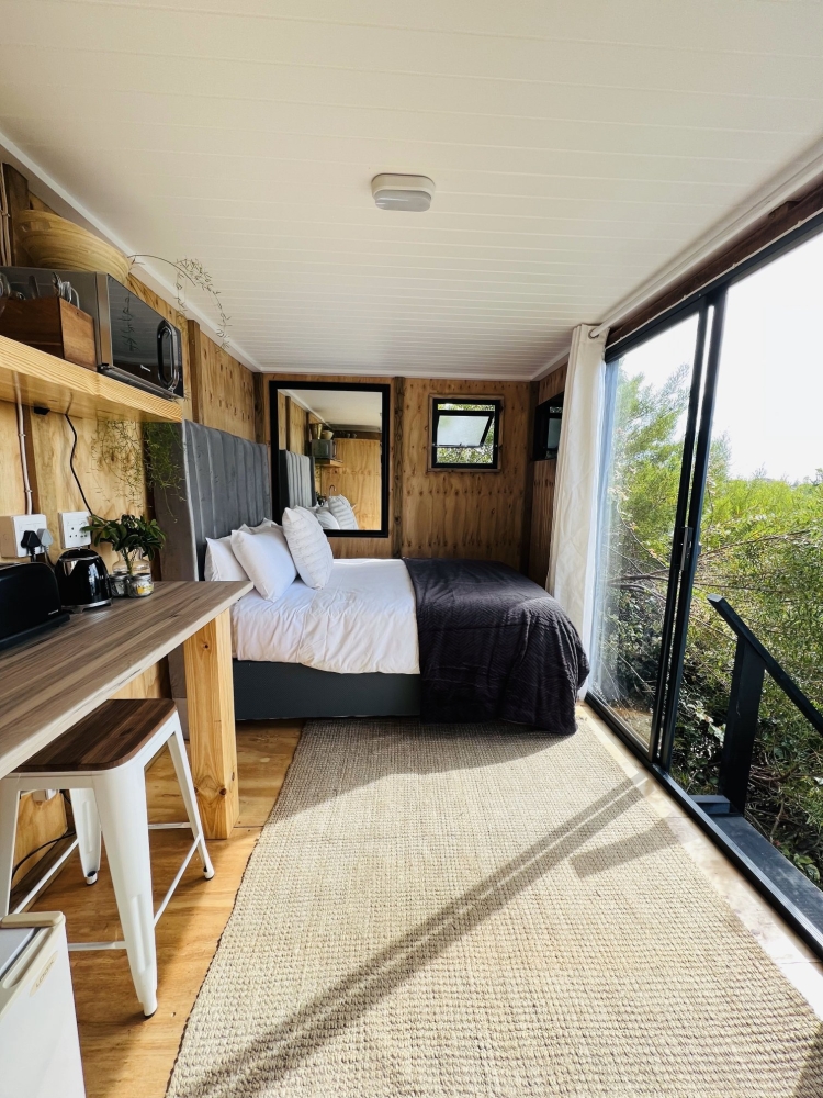 The living area features an open-plan design with a fully equipped kitchenette including a microwave, bar fridge, air-fryer, kettle, toaster, cutlery, and crockery.