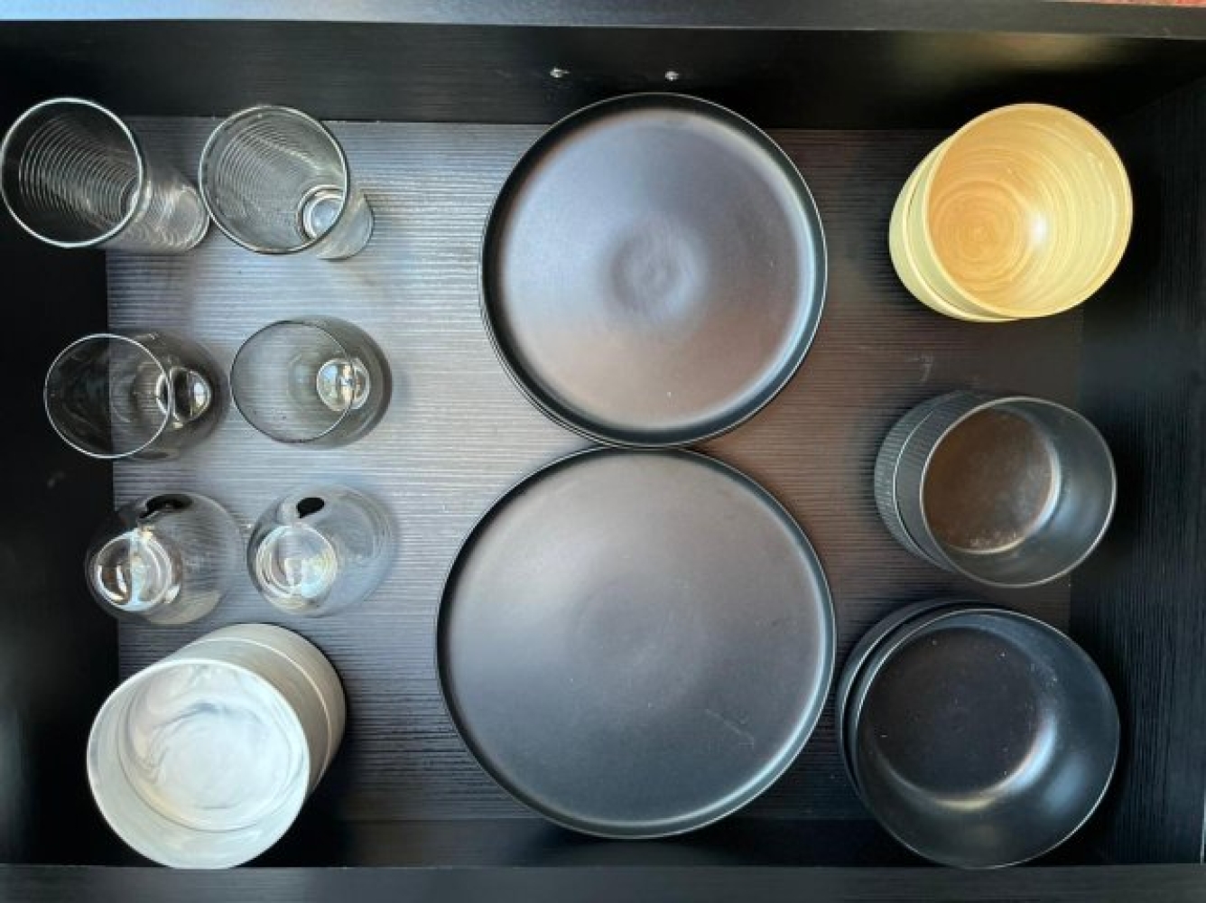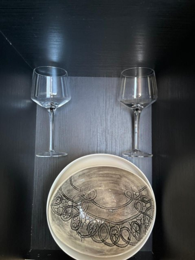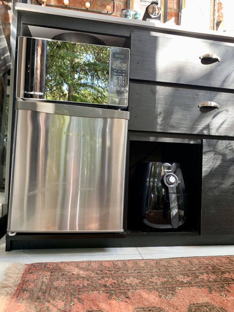 The living area features an open-plan design with a fully equipped kitchenette including a microwave, bar fridge, air-fryer, kettle, toaster, Nespresso machine, cutlery, and crockery.